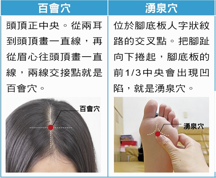 ①百會穴:頭頂正中央。從兩耳到頭頂畫一直線,再從眉心往頭頂畫一直線,兩線交接點就是百會穴。