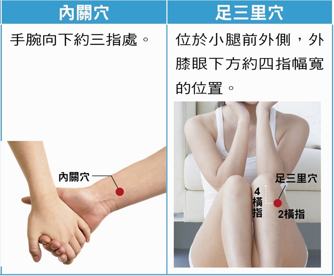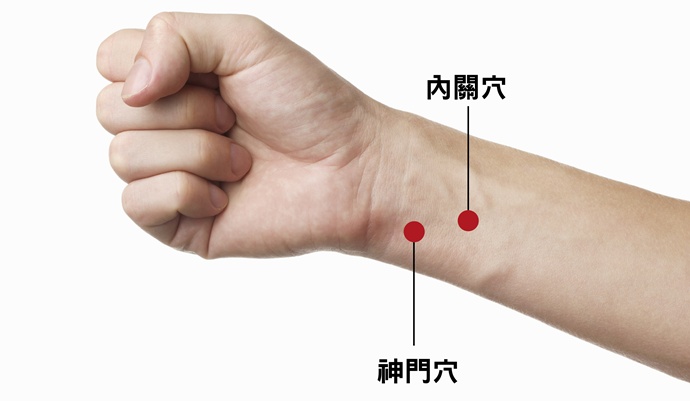 ①內關穴:手腕向下約三指處。