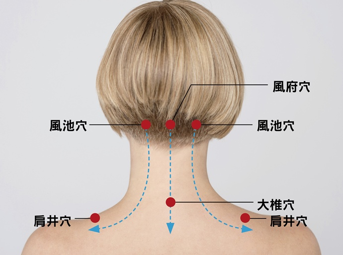 ①風池穴:在枕骨兩旁,髮際內有兩個凹陷處,高度差不多和耳垂平行。
