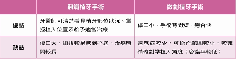 傳統翻瓣植牙和微創植牙手術的差異在於傷口大小。前者是藉由翻開牙肉、露出齒槽骨,直接植入人工牙根後再縫合;後者則會移除植牙頂端牙肉,不翻瓣直接鑽骨放入植體。兩者各有優缺點,通常會依缺牙區的骨質、骨量條件、角質化牙齦狀態來決定,齒槽骨骨量佳、不需要補骨的患者,才能進行微創植牙手術。