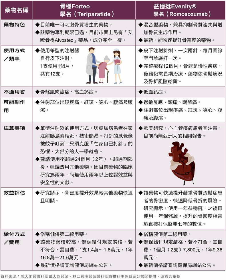混合作用型藥物是新興藥物,兼具抑制骨質流失與增加骨質生成的作用,益穩挺(Evenity®)是目前最新、能快速提升骨密度的藥物。